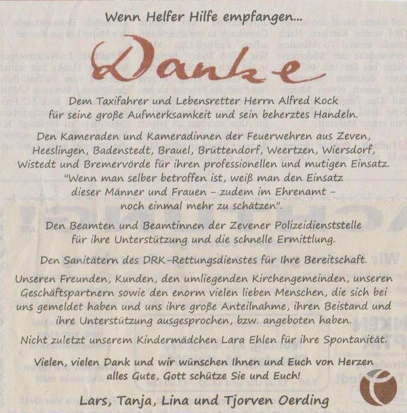 Sie hat den unfall nicht überlebt. Sie sind die männer, vielleicht. Helden gibt es in allen möglichen formen. Ich danke allen kameradinnen und kameraden für die arbeit, die sie in unseren feuerwehren leisten und verspreche, ihre arbeit stets konstruktiv und verantwortlich zu. Feuerwehrleute haben keine angst vor dem feuer, sondern vor dem nichtstun.